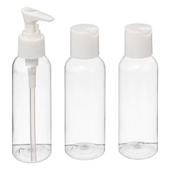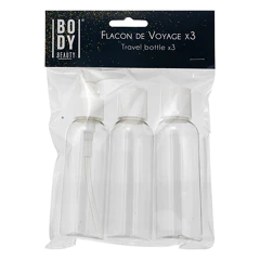 Pidä matkatarvikkeesi järjestyksessä! Tämä 3-osainen matkapakkaussetti on käytännöllinen ratkaisu kosmetiikan, toilettitarvikkeiden ja nesteiden säilytykseen matkoilla. Läpinäkyvät muovipullot tekevät sisällön näkemisestä helppoa, ja kompakti setti tarjoaa erilaisia pulloja eri tarpeisiin. Täydellinen kumppani matkoille ja lentomatkalle.
